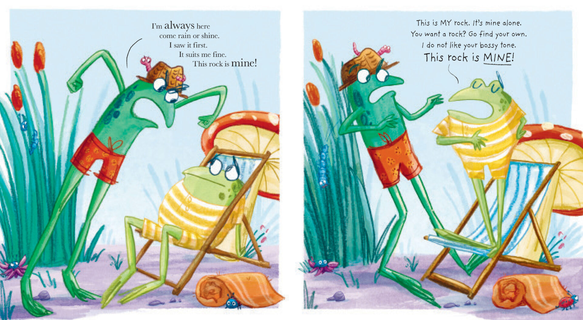 Two frogs find an ordinary little rock. It’s the perfect place to stretch their legs! But both frogs think it’s their rock—and they really don’t want to share. So what do they do? Why, make a huge fuss and start an uproarious squabble of course! Uh-oh. They’ve caused such a scene, that here comes a hungry heron. Perhaps they should put their differences aside and find a new rock…together?